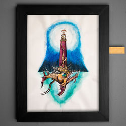 a Watercolour illustration of a Very old and very big Angler Fish adapted to catch Sailors at sea. The Fish has a Little Island on its back with a Lighthouse to lure unsuspecting Sailors, searching for Safe Harbour. By pulling the Wooden Tab to the right of the Frame, the Fish’s ‘Fishing Rod’ can be seen Inside the Lighthouse. It uses its Esca(The Light) as the Light for the Lighthouse.